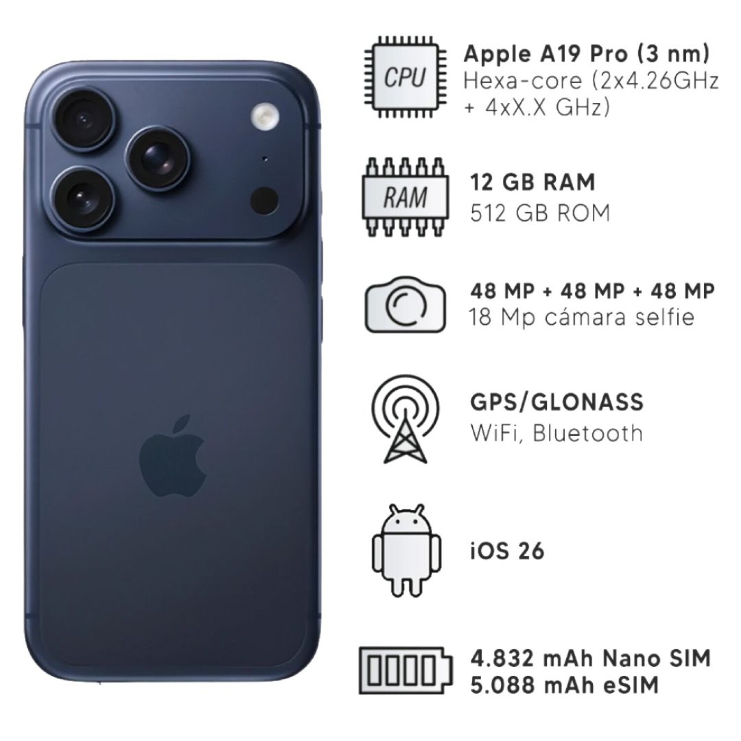 Procesador: Apple A19 Pro — CPU de 6 núcleos (2 núcleos de alto rendimiento + 4 de eficiencia), GPU de 6 núcleos, con Neural Engine.